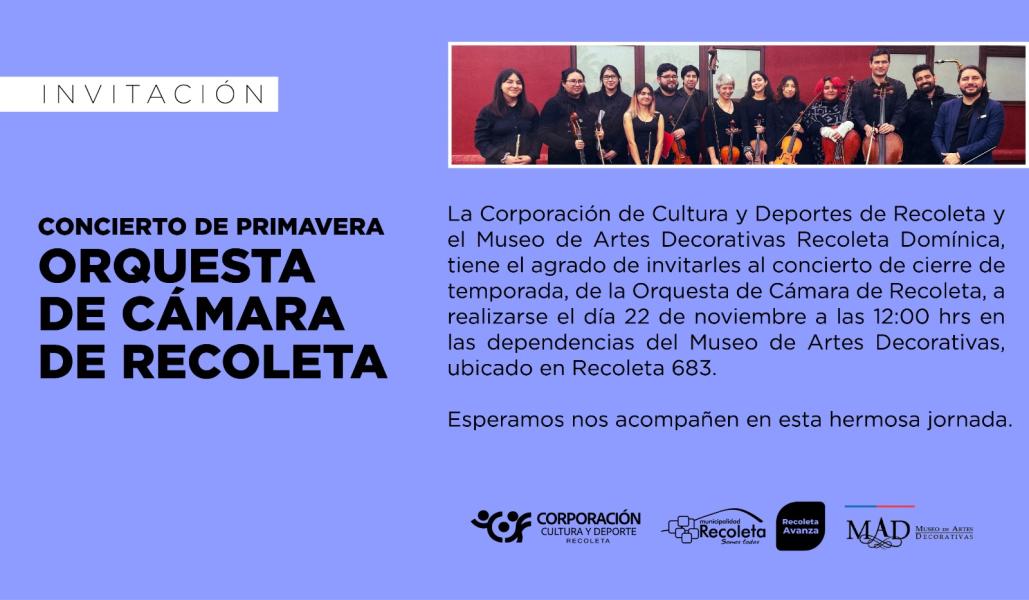 “Concierto de Primavera” que la Orquesta de Cámara de Recoleta realizará el sábado 22 de noviembre a las 12:00 horas, en el Museo de Artes Decorativas, ubicado en Av. Recoleta #683. Esperamos nos acompañen en esta hermosa jornada.