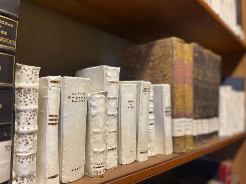 Todo este ambiente histórico será alterado por los objetos artísticos hechos en exclusiva por Tocornal, cuya motivación curatorial es interpelar la colección bibliográfica desde otra mirada, generando un corte visual, temporal y utilitario. De esta forma, el orden original establecido por metros lineales de conocimiento se quiebra con la propuesta rupturista en que los libros patrimoniales son sustituidos por moldes de volúmenes realizados en porcelana y con marbetes, nervios y otros detalles dorados que se intercalarán en las estanterías para dialogar con los libros antiguos, ofreciendo un juego de reemplazo en el que cederán su espacio a cáscaras sin información disponible que desplazarán aquellos tomos que contienen valiosos conocimiento sobre religión, derecho, filosofía, literatura, ciencias naturales, literatura, etc.